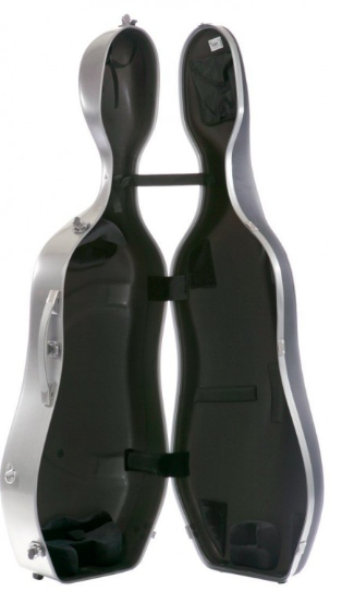Insturmento suspenso em almofadas de alta densidade Espaço para 2 arcos, Cinturões para apoios da voluta e braço Cinturão para o espigão Compartimento para guardas as cordas Dimensões do instrumento: