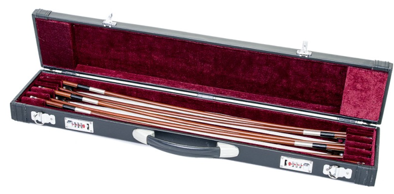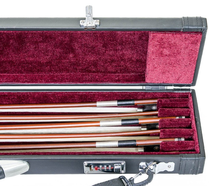 Este elegante estojo, resistente e com exterior em pele sintética, tem espaço para transportar em segurança até 6 arcos, violino, viola e violoncelo.