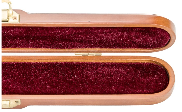 Estojo com exterior em madeira, e interior em veludo e almofadado.